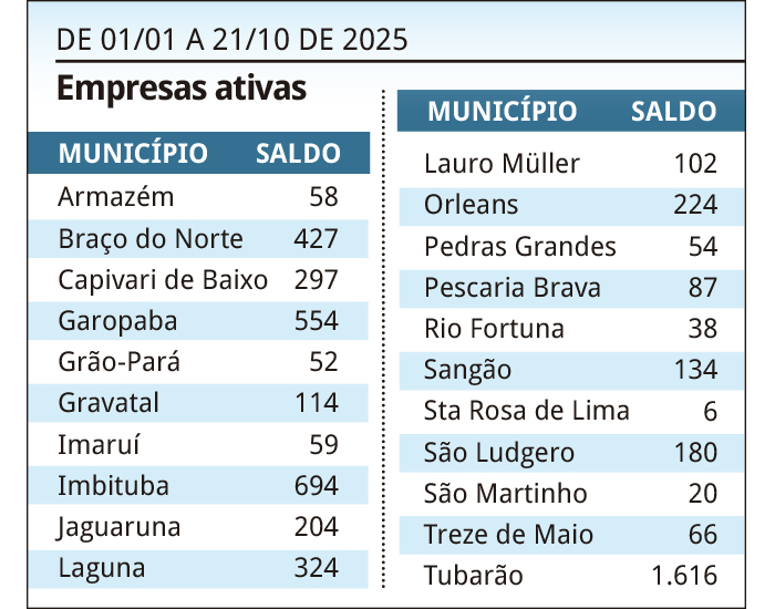 Entre os municípios que apresentaram o maior crescimento no número de novas empresas abertas, destaque para Pedras Grandes, que teve um salto de 116% este ano, em relação a 2024. Em seguida, vêm os municípios de São Ludgero (com aumento de 83,67%), Pescaria Brava (81,25%), Orleans (45,45%), Sangão (39,58%) e Imbituba (31,19%).