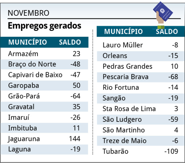Em relação ao saldo geral de trabalho com carteira assinada, destaque para os municípios de Armazém, Garopaba, Gravatal, Imbituba, Jaguaruna, Pedras Grandes, Santa Rosa de Lima e São Martinho (veja tabela ao lado).