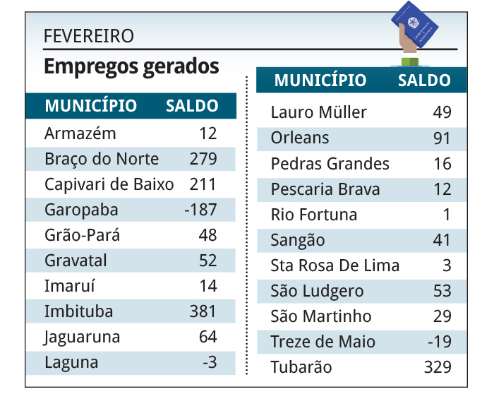 Em fevereiro, Imbituba, Tubarão, Braço do Norte e Capivari de Baixo foram os municípios que registraram os maiores saldos positivos de admissões, com 381, 329, 279 e 211 empregos novos, respectivamente.